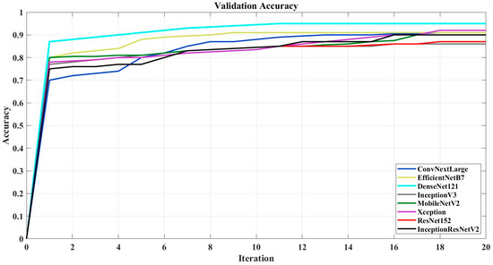 Upon examination of Figure 2, among the evaluated models, DenseNet121 demonstrates the highest validation accuracy, converging rapidly to near-perfect performance, thereby indicating its robustness and efficiency. EfficientNetB7 also achieves commendable performance, attaining a level of accuracy that is highly competitive, though marginally lower than that of DenseNet121. ConvNeXtLarge exhibits strong performance but does not quite attain the validation accuracy observed with DenseNet121 and EfficientNetB7. The remaining models—InceptionV3, MobileNetV2, Xception, ResNet152, and InceptionResNetV2—converge to relatively high accuracy values; however, they fall short when compared to the leading models. Notably, most of the models stabilize in terms of accuracy after approximately 10 to 15 iterations, suggesting that additional training beyond this point yields limited gains. In conclusion, DenseNet121 is distinguished by its superior accuracy, followed closely by EfficientNetB7, while the other architectures achieve comparable but slightly lower levels of performance.