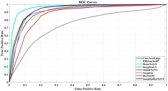 The performance of these models was thoroughly evaluated to determine their accuracy in classification tasks. The results of these experiments are summarized in Table 3, which compares the predictive performance of each model based on various metrics, while Figure 3 displays the ROC (Receiver Operating Characteristic) curves. As in Figure 2, the most successful networks from the ConvNeXt and EfficientNet families are included in this graph.