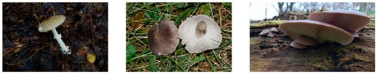 Among the diverse macrofungi, many species exhibit unique ecological relationships and have significant cultural, nutritional, or toxicological relevance. For instance, Amanita pantherina, also known as the panther cap, is associated with coniferous and deciduous woodlands and has a storied history in mystical practices due to its psychoactive components, ibotenic acid and muscimol [6,7]. In contrast, Boletus edulis, or porcini, is one of the most popular wild edible mushrooms, valued for its rich nutritional content, including proteins, vitamins, and essential minerals [8]. Similarly, Cantharellus cibarius, the chanterelle, is cherished not only for its flavor and culinary value but also for its significant levels of bioavailable vitamin D2, crucial for human health [9].
