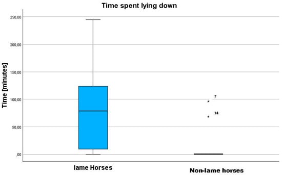 Non-lame horses rested their hindlimbs evenly (left: 15 ± 10%; right: 17 ± 16%). Lame horses spent more time lying down than non-lame horses (p = 0.025) (Figure 3).