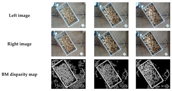 In this experiment, the materials used were potatoes grown in the Inner Mongolia region. Initially, the distance between the bottom of the container and the surface of the piled materials to the stereo camera was measured. The experimental design included the empty state of the container and three different piling states of potatoes within the container. By moving the container, the distance between the potato surface and the stereo camera at ten different positions was measured. Figure 10 and Figure 11, respectively, show the raw images, disparity maps, and pseudo-color maps obtained from the left and right cameras processed by two stereo matching algorithms under the empty container state and three loading conditions. The pseudo-color maps significantly enhance the visual effects and data readability of the disparity maps and other grayscale images through color mapping techniques.