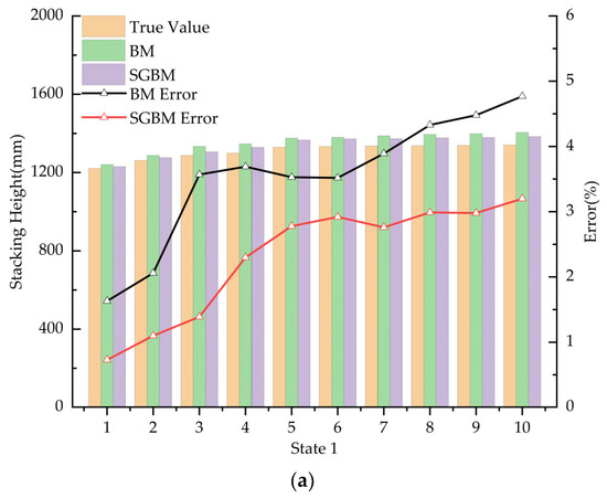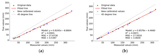 As shown in Figure 14, the errors before and after calibration are relatively large at lower stack heights. This is due to the definition of relative error and the nature of the values involved; relative error is the ratio of absolute error to the actual value. When the actual value is small, the denominator is also small, resulting in a larger relative error. Additionally, in this application scenario involving a material transport vehicle, the height of the vehicle’s cargo box is significantly greater than the first three data points presented in Figure 14. To better analyze the calibration effects, data with stack heights below 30 mm were excluded from the comparison of average relative errors.