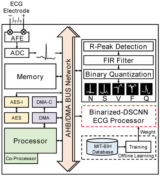 Adopting a general system-on-a-chip (SoC) architecture [56,57,58], as shown in Figure 1, this work proposes a five-type ECG signal classifier utilizing a binarized depthwise separable convolutional neural network (bDSCNN). While traditional CNNs operate convolution and pooling sequentially, the proposed method adopts a merged convolution–pooling (MCP) layer that combines the convolution and pooling layers to reduce the number of operations. Moreover, since the binarization method is utilized, the binarized weights and activation coefficients allow the multiplication to be simplified as AND logic, reducing the hardware resources required for multi-classification.