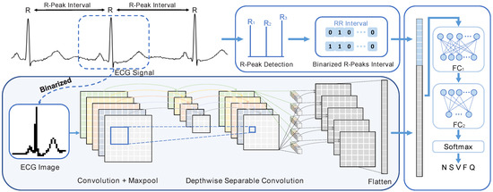 According to the World Health Organization, cardiovascular diseases (CVDs) are the leading cause of death, having been estimated to cause 17.9 million annual deaths globally [1,2]. Thus, the detection of CVDs in their early stages can reduce later complications and save curative costs [3,4,5]. Unfortunately, early-stage CVDs usually have no obvious symptoms [6,7] and are easily overlooked. Recent research has shown that detecting early-stage CVDs using electrocardiogram (ECG) sensors [8,9,10,11] provides a feasible solution to realize real-time monitoring and can decrease death rates effectively. As a result, the development of wearable devices for ECG signal detection and classification has become a trend and is attracting more attention [12,13,14,15,16,17,18,19].