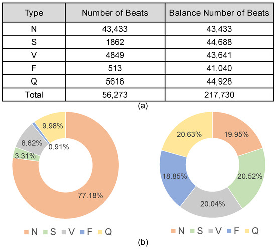 (a) The numbers of the five original classes and balanced beat subtype for training. (b) The proportions of the original and balanced data for the five types of beat data in training.