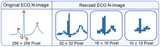 BCNNs require the transformation of 1D ECG signals into 2D images for capturing spatial structural features. Given the MIT-BIH dataset has R peaks annotated for each ECG beat, 300 ECG samples are taken around the R peaks (100 and 200 samples on the left and right of the R peaks), and the R peak interval data are calculated by measuring the time between consecutive R peaks. The Python 3 programming language and open-source OpenCV2 library are then employed to transform the samples into an image. The original and resized ECG images are shown in Figure 4. Larger sizes of ECG images offer more detail, but require more complex model structures and additional hardware resources. Smaller-size images lead to simpler model structures and less hardware resources, but suffer from less distinct P-QRS-T features. Taking both the classification accuracy and the model complexity into consideration, a binarized ECG image size of 32 × 32 px is chosen.