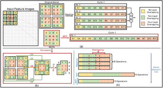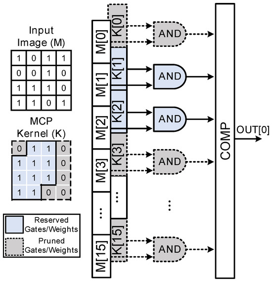 Figure 5c compares the number of operations between the proposed MCP and the “baseline” methods. One PE in the traditional methods consists of nine AND operations to realize a convolution operation, and 36 AND operations in total are required to perform four convolution operations. In contrast, in the proposed MCP method, only one PE, which contains 16 AND operations, is required. With an MCP kernel as shown in Figure 5b, the AND operations with “0” as input can be reduced. Figure 6 further provides the detailed hardware implementation for the pruning process. As a result, 16 AND operations are reduced to 10 operations, which is 3.6 times less compared with the traditional method.