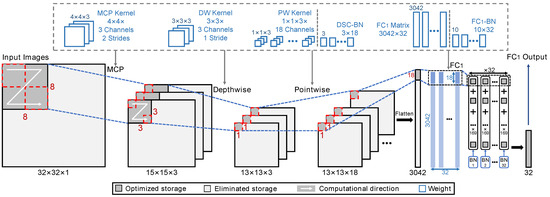 To reduce computations and eliminate repetitive storage between the input image and the first FC () layer, a blockwise incremental calculation scheme is adopted in the hardware implementation. The blockwise incremental computation method optimizes the inference process of the model without changing the parameters and structure, thus maintaining the same classification accuracy. Different from the traditional layer-by-layer calculation, in the blockwise incremental calculation process, the input images are reorganized into multiple blocks, and the blocks are processed one at a time through MCP, DSC-DW, DSC-PW, and layers until all the blocks are traversed and results are derived. The data flow of the blockwise incremental calculation is shown in Figure 7. The input image is convolved by multiple 4 × 4 MCPKs to form multichannel output feature maps. Then, the DSC operation is performed with three 3 × 3 DW convolution kernels and eighteen 1 × 1 × 3 PW convolution kernels to derive a 1 × 1 × 18 DSC feature map. In the following layer, the feature map is converted to 32 FC1 intermediate results by an 18 × 32 FC1 conversion matrix. To cover the full input image, the above operations are repeated 169 (13 × 13) times, and the results from each iteration are combined and normalized to derive the final output result.