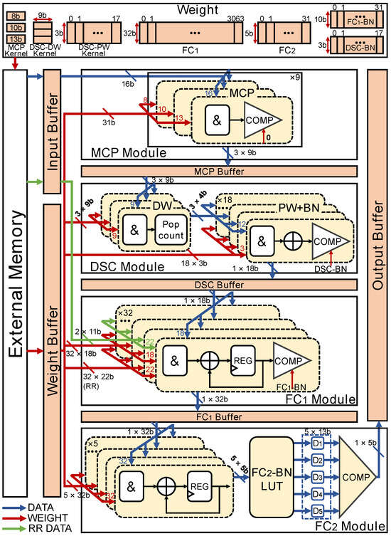 The overall hardware architecture of the proposed bDSCNN inference accelerator is shown in Figure 9. The weights of the proposed model are stored in the external memory and can be loaded for classification computation via a weight buffer. In addition to the MCP, DSC, and two FC modules, the system also employs an input buffer to store the input image and the RR interval data, storage buffers for the MCP, DSC, and layers, and an output buffer to store the classification result. The MCP module contains three kernels and each kernel is calculated with the input block image. The computation of each kernel is performed using AND gates and a comparator. To derive a 3 × 3 MCP feature map as shown in Figure 7, the above computation needs to be repeated nine times for one MCPK.