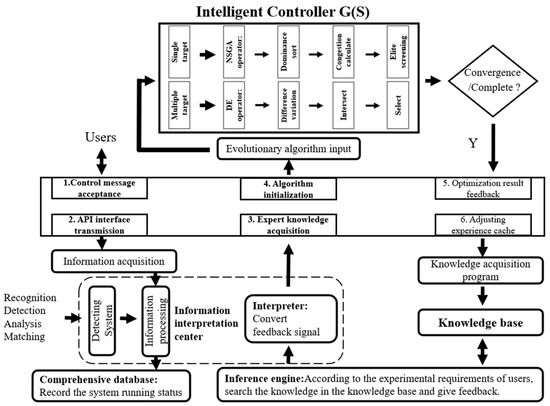 The detailed structure of the intelligent controller within the system is shown in Figure 2. The construction method of the intelligent control system for beam optimization involves establishing expert control based on the intelligent controller, G(S), as the forward channel function in the closed-loop optimization transfer function model. The feedback function, H(S), is formed by utilizing feedback spot position and parameters such as flux intensity as the fitness function. This feedback function, H(S), serves as the reverse channel function in the architecture of the closed-loop optimization transfer function. The whole process of intelligent beam tuning of the system is shown by the arrow in Figure 2, starting from the client and ending in the sequence of operation 1 to operation 6. By operating within the dotted lines in the diagram, the user’s experimental requests are identified, analyzed, and matched, and converted into experiences that can be fed back to the algorithm for initialization.