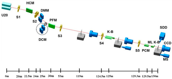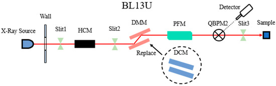 The BL13U beamline department houses important equipment, including the white slit, collimator (HCM, FMB, Oxford), multilayer monochromator (DCM, FMB, Oxford), pre-focusing mirror (PFM, Axilon, Germany), and light intensity detector (F2), along with other related auxiliary equipment. The optimization focused on the white slit Slit2, the multilayer monochromator DMM, and the pre-focusing mirror PFM. The beamline layout is illustrated in Figure 10.