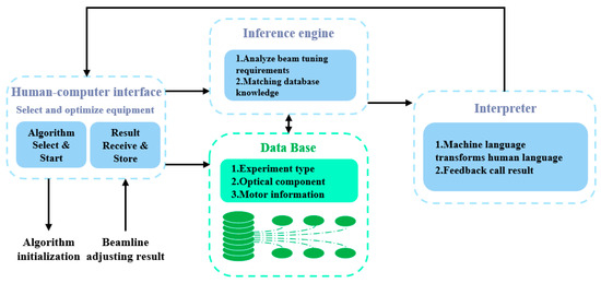 The structure of the expert system for beamline modulation control is shown in Figure 5. The upper layer interface is the interface for interaction between the user and the system. The user selects the optimized object according to the specific experimental requirements and sends commands and signals to the system. The interpreter decodes the knowledge containing the beamline adjusting experience, converts it into human language for feedback and description, feeds back the corresponding call results according to the user’s experimental requirements, and completes the initialization work based on these results. The algorithm quickly evolves to a convergent state and stores the results in the database to achieve system improvement.