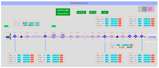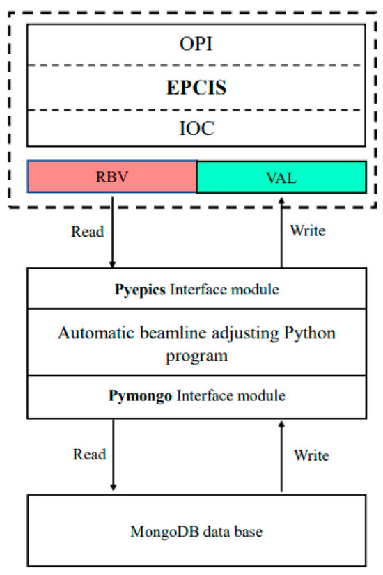 The EPICS control platform, integrated into the Linux system, offers a stable operating environment for intelligent beam optimization. The EPICS system incorporates various features such as remote equipment detection and control, automated script execution, closed-loop control, simulation modeling, visual data operations (acquisition, conversion, analysis, display, and storage), and security access mechanisms. These functionalities enable decentralized motion control and the centralized management of multiple motors along the beam line. EPICS showcases superior compatibility and expansibility, allowing it to seamlessly integrate with external programs. By utilizing the Pyepics module as a communication interface, a Python program for beam automatic optimization is developed to achieve intelligent control over the motor axes corresponding to the optical components. Furthermore, communication control between the Python program and MongoDB software is established through the Pymongo module. This allows for the retrieval and writing of expert experience to the database. The software structure design of the system is presented in Figure 6. The upper level Operation Interface (OPI) is developed based on CSS, as shown in Figure 7.