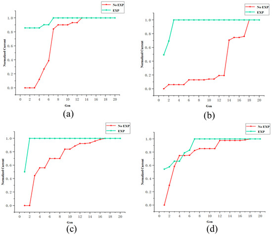 Optimization process of four groups of online tests. The horizontal axis represents the current evolutionary iteration, and the vertical axis represents the current intensity after normalization. The red curve represents the results under the random initial state, while the green curve represents the results when invoking the prior experience. (a) The optimized objects are Slit2-X1, X2, Z1, Z2. (b) The optimized objects are DMM-Roll. (c) The optimized objects are DMM-Pitch, Roll-, PFM-m1, and m2. (d) The optimized objects are DMM-Pitch and Roll.