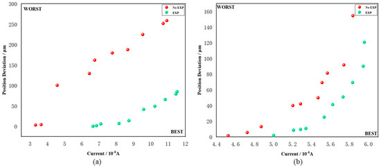 - During the optimization process, the algorithm iterates comprehensively towards two optimization objectives. Under the current beam state, the flux is optimized towards the maximum objective, while the spot position deviation is optimized towards the minimum objective. However, actual test results demonstrate that the two optimization paths are not entirely aligned and may even diverge. In such cases, the location of the obtained Pareto equivalent solution on the two-dimensional plane represents the algorithm’s comprehensive optimization results based on both objectives. These positions are represented by individual Pareto points in Figure 11. The ordinate represents the position deviation (measured in microns), and the abscissa represents the current intensity (measured in microamperes);