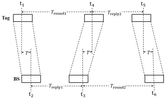 The time from the tag to the base station () can be calculated using Equations (1)–(5):