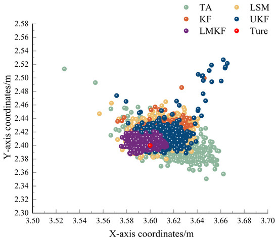 Due to the obstacles in the experiment, the signal propagation path between BS_A and Tag was not straight, resulting in a signal propagation time that was longer than the ideal propagation time. This caused the calculated distance between Tag and BS_A to be larger than the actual distance, which caused the localization results of the five algorithms to be biased to the upper right concerning the true position of the tag. Figure 12 shows that TA was most affected by NLOS, and the localization results of LSM, KF, and UKF were better than those TA, but a few points reflected the actual position of the tag. The localization results obtained by the LMKF were better than the other three methods, with more concentrated coordinates closer to the actual tag coordinates. The localization errors of the different algorithms are shown in Figure 12 and Table 4.