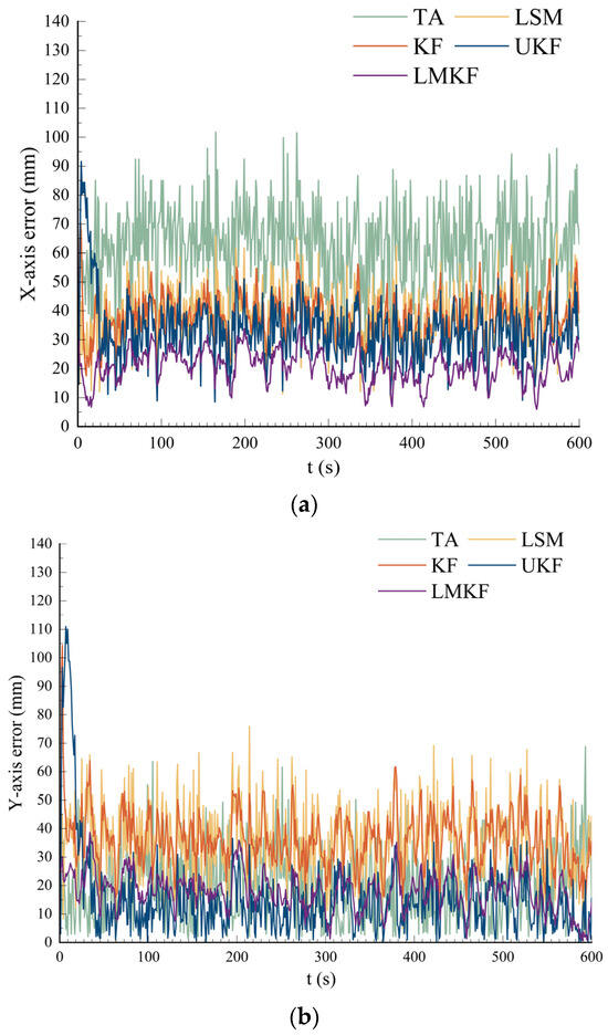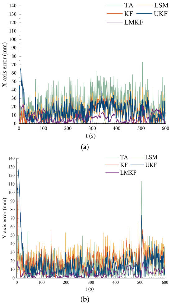 (a) Comparison of the X-axis error; (b) comparison of the Y-axis error.