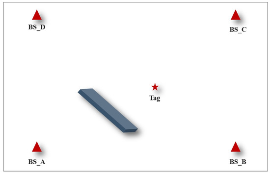 The signal propagation path is not a straight line because there are many obstacles in the actual localization process. It needs to be propagated through other paths such as reflection, refraction, etc., in which case the accuracy of the UWB localization algorithm is greatly affected. Therefore, to analyze the performance of the positioning algorithm proposed in this paper in an NLOS environment, based on the above experiments, the equipment arrangement was as shown in Figure 10. Obstacles were set up between BS_A and Tag to block the signal’s linear propagation between BS_A and Tag. The coordinates of the base station in the experiment were BS_A (0,0), BS_B (6,0), BS_C (6,5.4), and BS_D (0,5.4), and the coordinates of the tag were Tag (3.6, 2.4). The results of the five localization algorithms are shown in Figure 11.