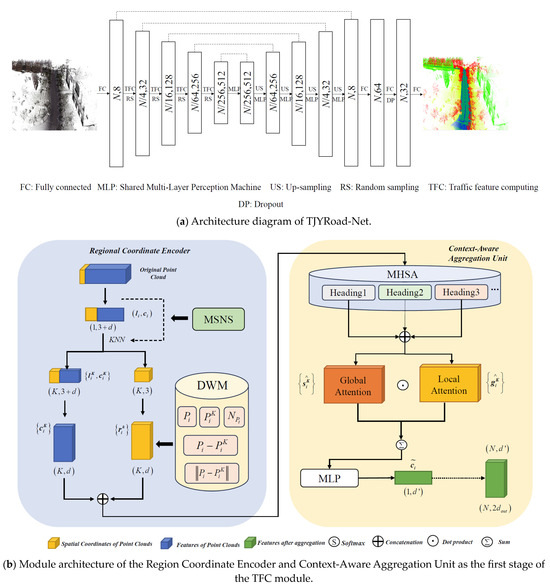 The TJYRoad-Net framework, specifically designed for large-scale road traffic scenes, introduces a novel architecture to handle the challenge of semantic segmentation in complex and high-density point cloud environments. It improves segmentation performance for large-scale road infrastructure datasets, particularly those generated from oblique drone imagery. The structure of the network is shown in Figure 5.