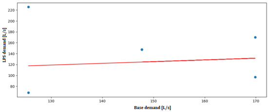 This positive trend reflects the expected increase in base demand as pipe diameters increase. Larger pipes are generally installed to handle greater water flows in areas of higher demand, such as those with denser populations or more commercial activity. The model’s slope (0.1847) indicates a moderate increase in base demand with diameter, suggesting a proportional scaling of resources required to maintain sufficient water supply across varying node demands. The high intercept value (119.06 L/s) is consistent with the baseline demands associated with the core network, which supports a large urban population. If we compare the values of base_demand and demand_lps obtained, we obtain the linear regression shown in Figure 6. This figure illustrates how the blue data points represent the data used to train the model: the simulation values. The red line represents the line of best fit generated by the model itself, which follows the trend of the data points. In this case, we select one of the base demand values previously calculated, such as 169.88 L/s to interpret the results. The model predicts that the node will demand nearly 140 L/s by drawing an invisible vertical line. If the calculated base demand is lower, the model predicts a lower demand from the node. The model thus determines the slope and intercept values that best predict the node’s demand.