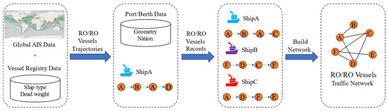 This study focuses on the RO/RO vessels relations between nations. Hence, as shown in Figure 1, the global AIS data and vessel registry information, such as ship type and deadweight tonnage, are first used to track the navigational trajectories of RO/RO vessels. Next, these trajectories are matched with national and berth data to generate entry and exit records for vessels in different countries. These records depict the actual routes traveled by each ship between nations, forming the OD (origin–destination) data. A shipping network with ports as nodes and RO/RO vessels’ navigation paths as edges is established. G = {V,E}, where V = {“all nations to which RO/RO vessels navigate”} and E = {“nation pairs”}. When establishing a shipping network, the numbers of navigations by different RO/RO vessels between each of these port pairs are adopted as weights.