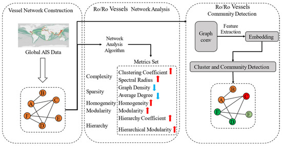 Taking RO/RO vessels as the research object, this paper utilizes AIS data to conduct an in-depth analysis of RO/RO vessel network characteristics using advanced techniques such as complex network analysis, graph convolutional networks (GCNs), and clustering analysis. The study examines five key dimensions. By extracting structural features from the graph, community detection is performed to reveal potential clusters and shipping patterns within the network. Additionally, the paper integrates China’s rapid growth in automobile exports and its overseas factory expansion strategy to comparatively analyze the changes in network characteristics under different influencing factors. It explores the impact on global trade flows, port connectivity, and the structure of the shipping network as they relate to future developments. Ultimately, this paper provides a robust theoretical foundation for understanding the role of RO/RO vessel shipping networks in global supply chains and offers valuable insights for policymakers and industry stakeholders in optimizing shipping routes and port layouts, as shown in Figure 2.