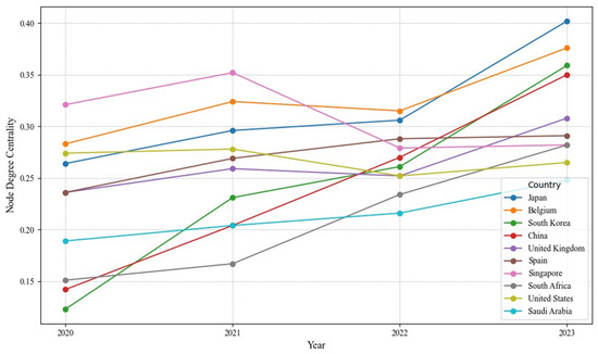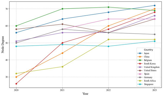 Japan’s node degree centrality rose from 0.264 in 2020 to 0.402 in 2023, indicating an increasing role for Japanese ports in the global transport of automobiles and heavy equipment. Ports like Yokohama and Nagoya recovered swiftly after the pandemic and actively expanded routes to Asia and North America. Similarly, South Korea’s node degree centrality increased from 0.123 to 0.359, underscoring the strategic importance of Busan and Pyeongtaek ports for Asian trade and transshipment. Belgium’s node degree centrality rose from 0.283 to 0.376, driven by Antwerp’s role as a major European hub, achieving a level of global connectivity surpassing even larger economies. This highlights the impact of regional hub status and advanced infrastructure on a country’s centrality within the network. South Africa’s node degree centrality grew from 0.151 to 0.282, underscoring its bridge role between Africa and the global shipping network, gradually establishing it as a strategic logistics node in the Southern Hemisphere.