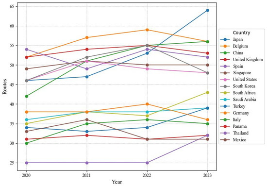 From an overall perspective, the number of routes in the global RO/RO shipping network exhibited varied fluctuations from 2020 to 2023, with adjustments seen across nations, particularly in major logistics hubs and emerging markets. Some countries, such as Japan and China, gradually increased their route numbers, underscoring their growing importance in the reconfiguration of the global RO/RO supply chain. In contrast, traditional logistics powerhouses like the United States and Germany maintained relatively stable route counts, as detailed in Figure 6.