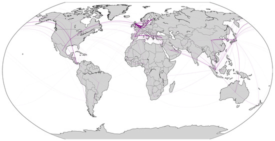 For a comprehensive study of data on the RO/RO shipping network over a long period of time, AIS data were collected for 858 RO/RO vessels with a deadweight tonnage (DWT) of ≥10,000 t, which had participated in international voyages around the world. These vessels were collected from Lloyd’s Register of Shipping, and the AIS data, covering the period from 2020 to 2023, were processed to identify vessel entry and exit events between countries. From 2020 to 2023, the average growth rate of records was 7.1%, and a total of 33,470 records were obtained in 2023. Similarly, both the number of routes and the number of nations increased, as detailed in Table 1.
