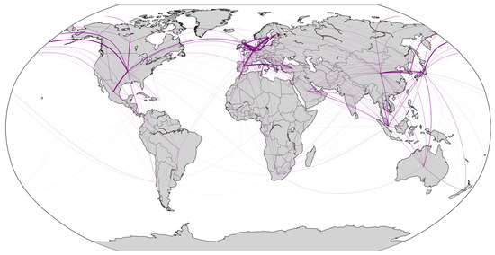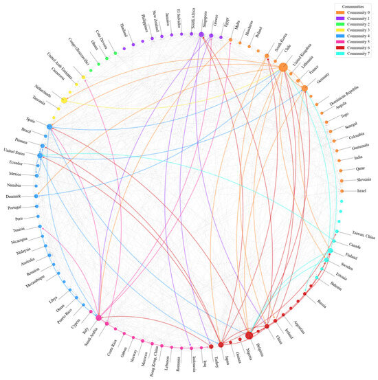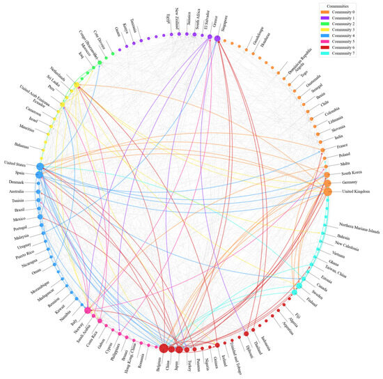 As shown in Figure 7 and Figure 8, the geographic spatial characteristics and regional distribution of the network reveal a global reach, with key regions centered in Europe, North America, and East Asia, primarily concentrated in the Northern Hemisphere. Within Europe and among the three major East Asian countries, a dense network is observed, reflecting the port clustering effect in these regions. In the Southern Hemisphere, major countries such as South Africa, Australia, Brazil, and Argentina are connected by RO/RO shipping routes. The RO/RO shipping network displays a cross-regional pattern, with dense routes linking East Asia, Europe, and North America, indicating a busy trade network for RO/RO shipments between these regions. It is evident that the global RO/RO shipping network includes intra-community routes and inter-community connections.