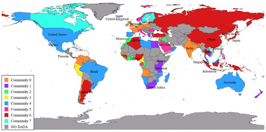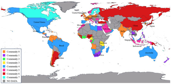 Compared with the models, we found a better set of hyperparameters, where the base model is GIN, the number of layers is three, the number of neurons in each layer is eight, the activation function is ReLU, and the learning rate is 5 × 10−5. In 2020, the model results classified countries into eight clusters, with the proportion of the largest number of countries in a single community being 22.7%. The silhouette coefficient was 0.570, and the Davies–Bouldin index was 0.534. In 2023, the results showed eight clusters, with the proportion of the largest number of countries in a single community being 21.1%, the silhouette coefficient being 0.548, and the Davies–Bouldin index being 0.559.