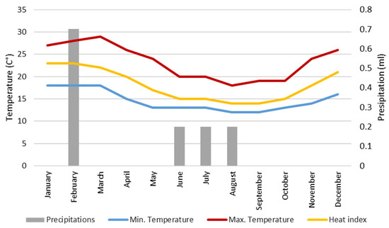 In this area, during 2022, the highest temperatures were recorded in March, reaching an average of 29 °C. Conversely, the lowest temperatures occur between the months of June to August, with a minimum temperature of 12 °C. Meanwhile, January and February experienced the highest heat index, reaching 23 °C. Although this area does not experience high levels of precipitation, the months with the highest rainfall are June, July, and August. Regarding wind speed, January records the highest winds at 11 m/s, the highest recorded throughout the year. Figure 1 illustrates the average temperature, heat index, and precipitation indexes recorded in the study area during 2022 using a weather station (Davis Instruments, Hayward, CA, USA) [24] positioned at the university campus.