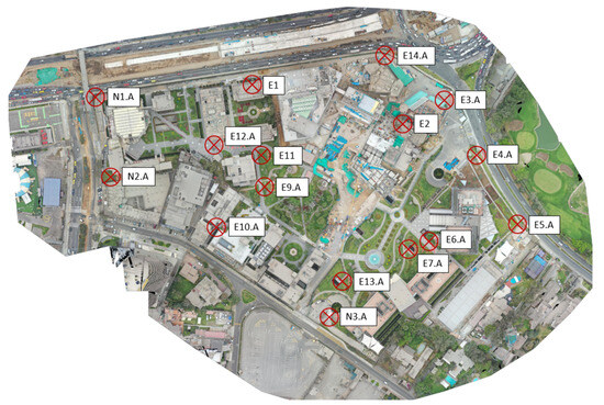 Initially, two types of flights were conducted over the study areas. On the one hand, to obtain orthomosaics of the area, flights were conducted at a height of 100 m with the camera positioned at 90° (perpendicular to the ground), aiming to minimize image distortion during orthomosaic processing. On the other hand, flights were conducted at a height of 50 m with the camera positioned at 45° to capture more detailed information about the facades of the buildings for generating point clouds with higher precision. Finally, for the present study, these flights were filtered and selected for analysis in both projects.