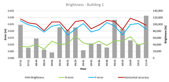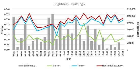 From these values and the collected climatological data, the quantitative influence of each of these factors on flight outcomes for each building was analyzed, as depicted in Figure 3, Figure 4, Figure 5, Figure 6, Figure 7, Figure 8, Figure 9, Figure 10, Figure 11 and Figure 12. In relation to these figures, it is important to mention that the time intervals between the different observations are available between 1 min and 102 min. Also the data were collected during different times of the year during the construction of the buildings. Concerning brightness in the analysis of Building 1, Figure 3 illustrates along the X-axis trend line (TL) how the error increases closer to the midday hours; a similar behavior can also be seen in the center-to-center error. It can also be noted that values of brightness lower than 58,000 lx result in a decrease in the error. Regarding Building 2, depicted in Figure 4, it can be observed that the error increases from midday to the afternoon hours, as shown in the X-axis, Y-axis, and center-to-center trend lines. The values of brightness between 25,300 lx and 36,000 lx during 9:05 and 9:45 h in the morning resulted in the most stable errors in both axes as well as the horizontal accuracy. It is important to note that during the afternoon hours of low brightness, the error increased for all axes.