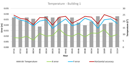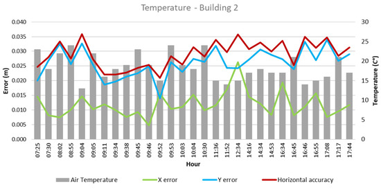 Regarding temperature, as illustrated in Figure 5, in Building 1, the lowest errors were found in temperatures between 19 °C and 23 °C, which were obtained during flights between 08:54 and 09:59 in the morning hours. As for Building 2, temperatures between 16 °C and 23 °C resulted in lower errors. Similarly to Building 1, these represented flights between 09:05 and 09:52 in the morning.
