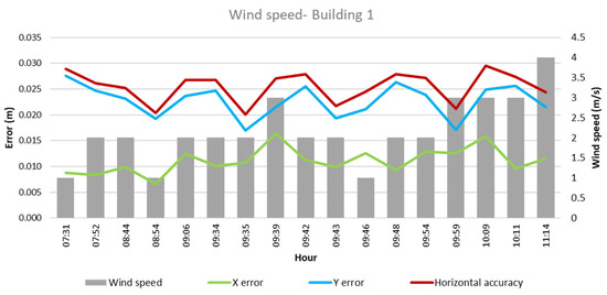 As for the wind speed, in the case of Building 1, as evidenced in Figure 7, lower error values are found on the horizontal accuracy and the X-axis, with wind speed levels between 1 and 3 m/s. Meanwhile, Building 2 presents a similar behavior, with the lower error recording wind speeds of similar values.