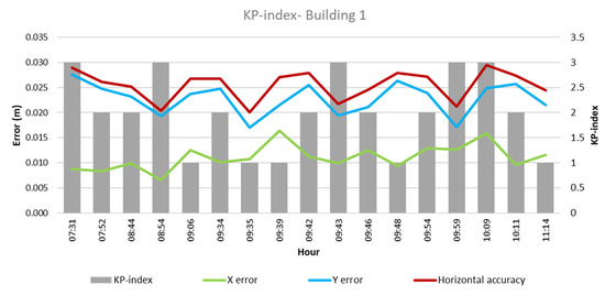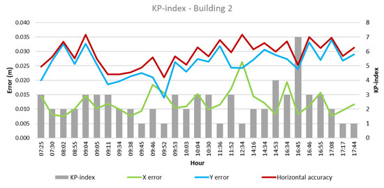 The KP index as per the analysis of Building 1, represented in Figure 9, does not reveal a clear relation between the error obtained and the KP index values, as both the lowest and highest errors of 0.007 m and 0.03 m, respectively, presented a KP index of 3 and a KP index of 1, which also produces a variety of values in error. Similarly, in Building 2, there is no clear indicator that the KP index has a strong influence over the errors obtained—however, a high KP index during the afternoon hours, 16:34 to 16:55, increased the error values.