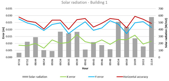 Finally, in the case of Building 1, as shown in Figure 11, it is observed that lower solar radiation values, between 64 and 224 W/m2 and during the flights between 07:31 and 09:06 in the morning hours, result in a lower error in precision, indicated by the X-axis and horizontal accuracy trend line. Regarding Building 2, both X- and Y-axes, along with the horizontal accuracy, exhibit lower error values when solar radiation of 27–456 W/m2 is presented, occurring during 07:30–09:52 of the morning hours. While the solar radiation values were low during the afternoon hours, the error, in general, increased.