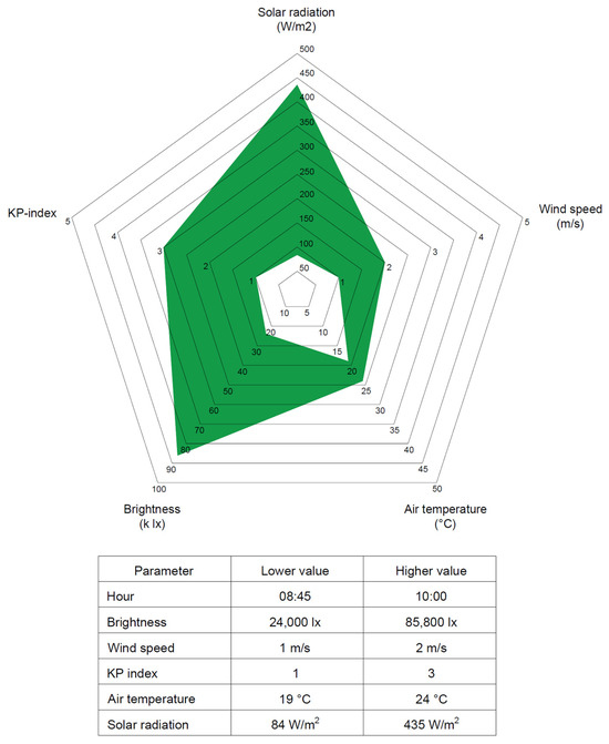 Regarding the wind speed, a variable behavior was identified, depending on the measurement axis. While in some cases, higher wind speed is associated with lower errors, in other axes, a contrary pattern is observed. Observing the horizontal accuracy, the results show, in general, that a wind speed of between 1 m/s and 2 m/s provides a better opportunity to obtain good accuracy results, as UAVs are susceptible to wind disturbances [13]. In addition, values of the KP index that were 3 or higher also presented a higher chance of lower horizontal accuracy. This aligns with the fact that a KP index above 3 can lead to disruption in the GPS reception [11]. Furthermore, taking into account the hour of the day when the images were collected, as recommended by [14], there is a higher recurrence of projects with an accuracy between 0.2 and 0.25 cm when flights were realized between 8:45 am and 10:00 am and during the months of November and March. Figure 13 shows the most favorable ranges for each climatological factor and the most favorable hours found during this case study. Each point in the pentagon represents a climatological factor studied. The green area indicates the dominium where the best results would be found, taking into account all the parameters indicated and the position of the information acquired in the five axes.