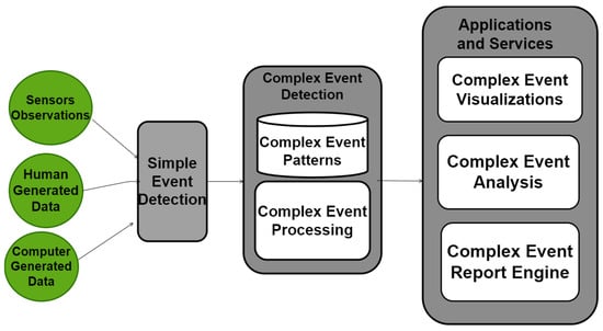 Figure 2 illustrates a high-level workflow for CED. This workflow is inspired by [20]. In CED, complex events are derived from diverse data sources, which can be classified as sensor data (e.g., RFID data) [21], human-generated data (e.g., social networks content) [22], or computer-generated data (e.g., bank transactions) [23]. These data streams are then processed to identify simple events, which can be detected based on straightforward conditions, such as surpassing a threshold within a specific time and location. Fundamentally, detecting simple events involves identifying significant occurrences within the data [24]. The detected simple events are subsequently fed into the CED process as event streams, using CEP engines to identify complex events. These complex event streams can be utilized in various applications and services for visualization purposes [25], analytics [26], or reporting [27]. For each service, there is a complex event patterns database that stores predefined rules for constituting complex events from simple events.