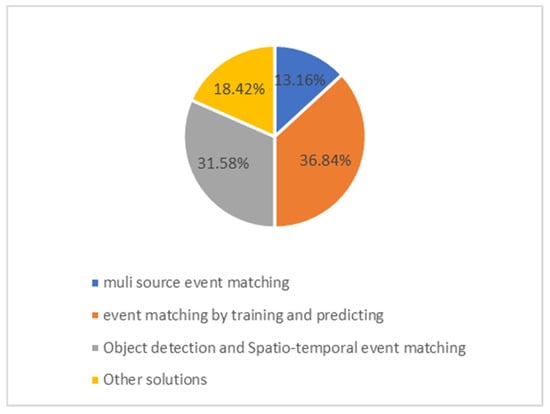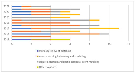 We grouped the studies based on the type of event detection method used (e.g., object detection, spatio–temporal analysis, deep learning approaches) and compared the strengths, limitations, and applicability of each method. The challenges specific to each category were discussed, such as tracking issues, frame delays, and object occlusions. Finally, statistical analysis was conducted on the numbers of research studies in each category.