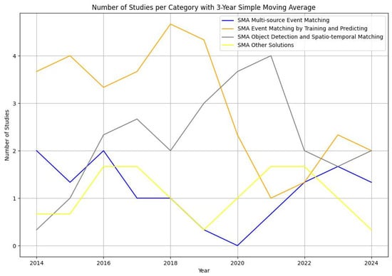 The primary objective of this section is to present a comprehensive review of various complex event-matching methods. In our review, we used a correlation matrix to evaluate the distinctiveness and overlap among different methods used for complex event matching in video streams. By examining intersections in methodological features, we were able to determine the degree of alignment or overlap among categories, specifically analyzing the presence of shared techniques across groups. The matrix highlighted limited but notable overlaps, particularly between multi-source solutions and other categories, confirming that these methods have unique integration-focused characteristics with minimal intersection. Similarly, minor overlaps between object detection and spatio–temporal matching and approaches based on training and predicting suggested that while neural networks were used in both, they served different roles across categories. Based on this analysis, we concluded that the four categories—object detection and spatio–temporal matching, approaches based on training and predicting of videos, multi-source solutions, and others—provided the best categorization, capturing distinct methodological approaches while acknowledging limited overlaps that further validated the robustness of our classification scheme. The methods discussed in this review have been categorized into the following sub-sections, each of which includes examples of relevant studies in their respective categories.