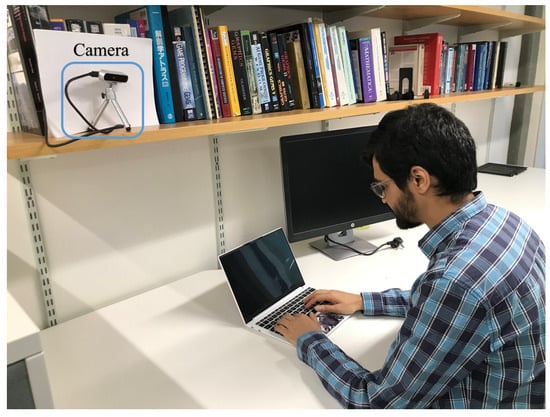 The vision-based system employs standard, off-the-shelf equipment, including an RGB-D camera (RealSense D415 [12]) and a compact computer processor (Jetson Orin Nano [13]). The camera is positioned on a shelf, approximately 1 m above the participants, to ensure full upper-body visibility (see Figure 1). It provides both color and depth images at 640 × 480 resolution and 30 frames per second and captures human movements in real time. Standard image processing functions, such as body region extraction and optical flow estimation for body movement measurement [25,26], are performed by the compact processor.