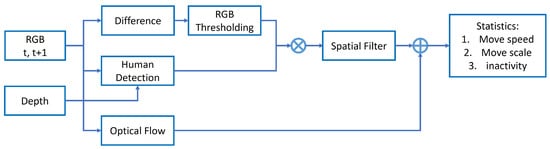 Specifically, computer vision algorithms were employed, including non-parametric background modeling in the depth map [27] and human body identification in the foreground. This was followed by the detection of significant pixel variations on the human body based on changes in RGB color-channel values. Detailed calculations and parameters for these methods are described in [28]. Subsequently, the pixel-wise movement vector was computed using dense optical flow [29] applied to the significantly varying pixels extracted in the previous step. The method processes visual data at a rate of 7–8 frames per second, with no original images saved to protect privacy. For each frame, the 2D coordinates of the extracted human-body bounding box, the number of significantly varying pixels, and their respective 2D coordinates and optical flow were used to calculate movement statistics. The pipeline for the monitoring system that extracts body movement features is illustrated in Figure 2.