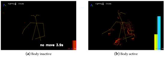 Inactivity: The proportion of time during which no movement is detected while the person is within view is calculated as the number of frames with no detected body motion () divided by the total number of frames with detected bodies () captured during that time period. This metric measures the ratio of inactivity.