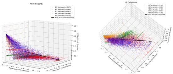 A 3D scatter plot showing the relationship between three standardized features—movement speed, movement scale, and inactivity—for all participants’ samples (n = 10,055 min). (Left) side view; (right) top view. The black arrow represents the first principal component, which captures the direction of maximum variance in the data. The features are correlated, with movement speed and movement scale showing a strong positive correlation (0.742), while movement speed and inactivity (−0.612), and movement scale and inactivity (−0.763) exhibit strong negative correlations.