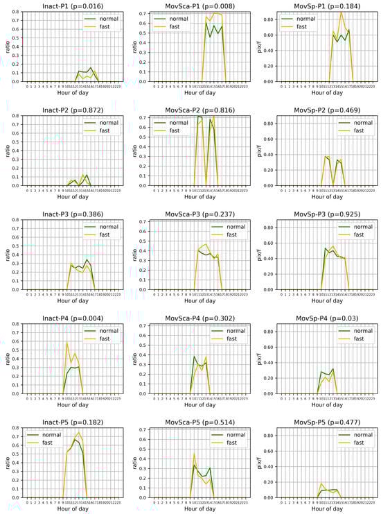 Comparison of hourly averaged inactivity (Inact), movement scale (MovSca), and movement speed (MovSp) for five participants (P1–P5) during fasting and non-fasting days. The p values indicate the significance of differences between fasting and non-fasting conditions. Note that only hours with at least four appearances by participants across all days were included in the comparison to avoid bias.