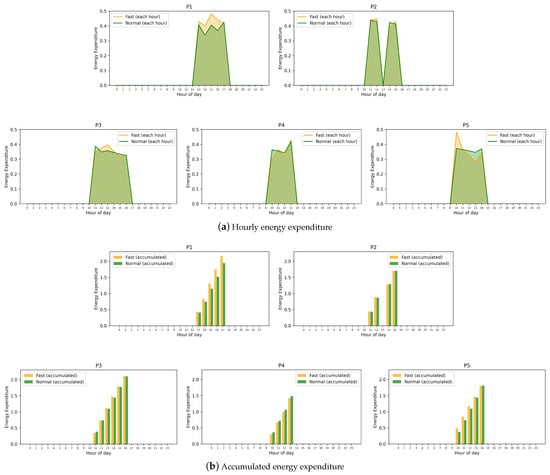 (a) Hourly energy expenditure for participants P1–P5 estimated at different hours (averaged across days). (b) Accumulated hourly energy expenditure for participants P1–P5 over time (averaged across days).