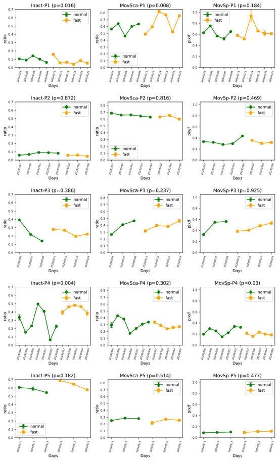 Daily comparison of inactivity (Inact), movement scale (MovSca), and movement speed (MovSp) for five participants (P1–P5) during fasting and non-fasting days (dates when the participant appeared for less than 3 h were discarded). Each plot represents the daily means of these features. The p values indicate the significance of differences between fasting and non-fasting conditions.
